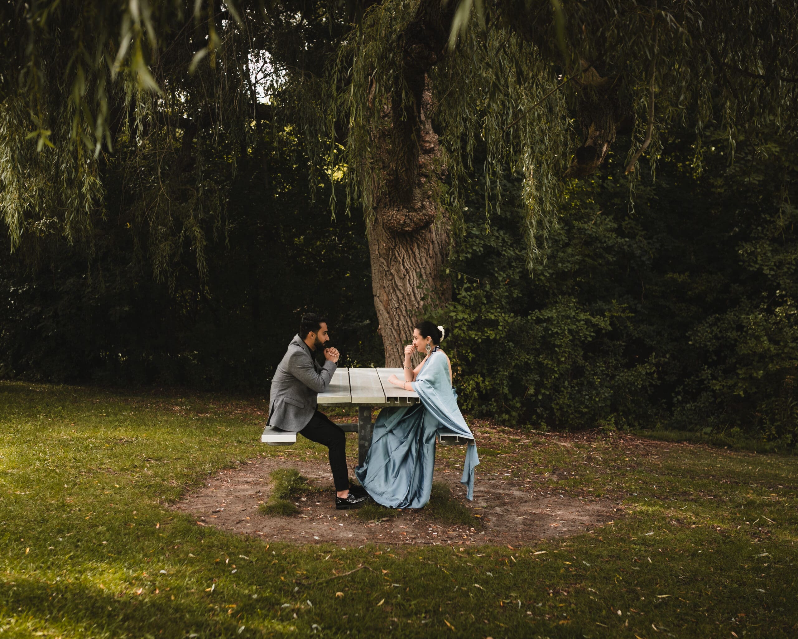 The best engagement photo outfits in Toronto are not always the fanciest ones. They’re the ones that make sense for the space around you. A heavily embellished lehenga can look breathtaking in the right downtown setting. A relaxed dress and rolled linen shirt can feel perfect by the water. A saree in a garden can feel timeless. A structured suit in architectural downtown can feel instantly elevated.
